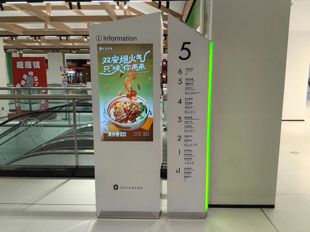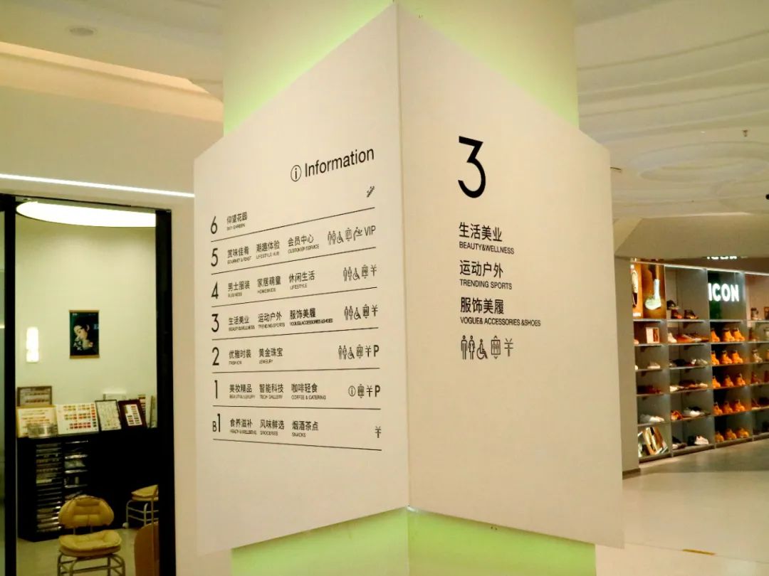 阛阓导视系统是毗连主顾与空间的要害纽带,,,,,,,双安阛阓此次在各楼层设置与该区域气概调性相匹配的导视,,,,,,,让主顾“五秒定位目的” 。。。。。。。 。设立全局导览、区域指引、点位标识的三级导视系统;; ; ; ;;;;融入个性化设计,,,,,,,搭配灯光、造型、科技应用、文化元素等,,,,,,,兼顾功效效率与情绪体验 。。。。。。。 。双安阛阓范文宇先容,,,,,,,此次特殊使用了差别化导视系统给主顾新鲜感,,,,,,,好比三层中区设有“柱面导视”,,,,,,,主顾无论从哪个偏向都能看到导视内容 。。。。。。。 。